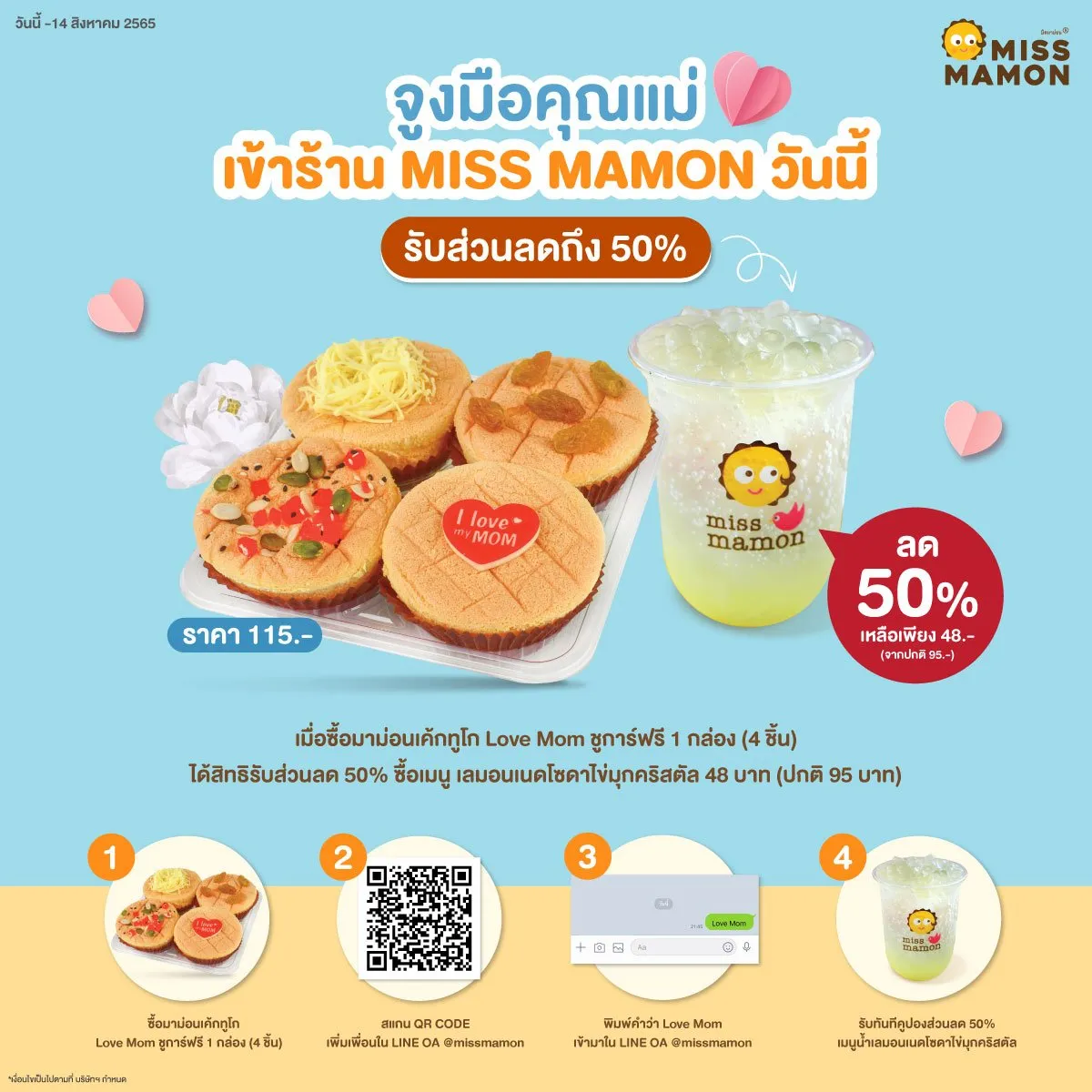 - พิมพ์คำว่า “Love Mom” รับคูปองส่วนลด 50% กับเมนูน้ำเลม่อนเนดโซดาไข่มุกคริสตัล ไปเลย!!