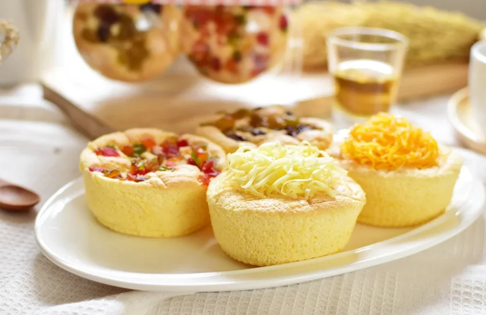 - ใส่พิมพ์ : ตักส่วนผสมเทใส่พิมพ์ เลือกโรยหน้าได้ตามชอบ (ยกเว้นหน้าเชดดาร์ชีสและฝอยทองยังไม่ต้องใส่ เพราะจะต้องนำมาโรยหลังอบเสร็จ)