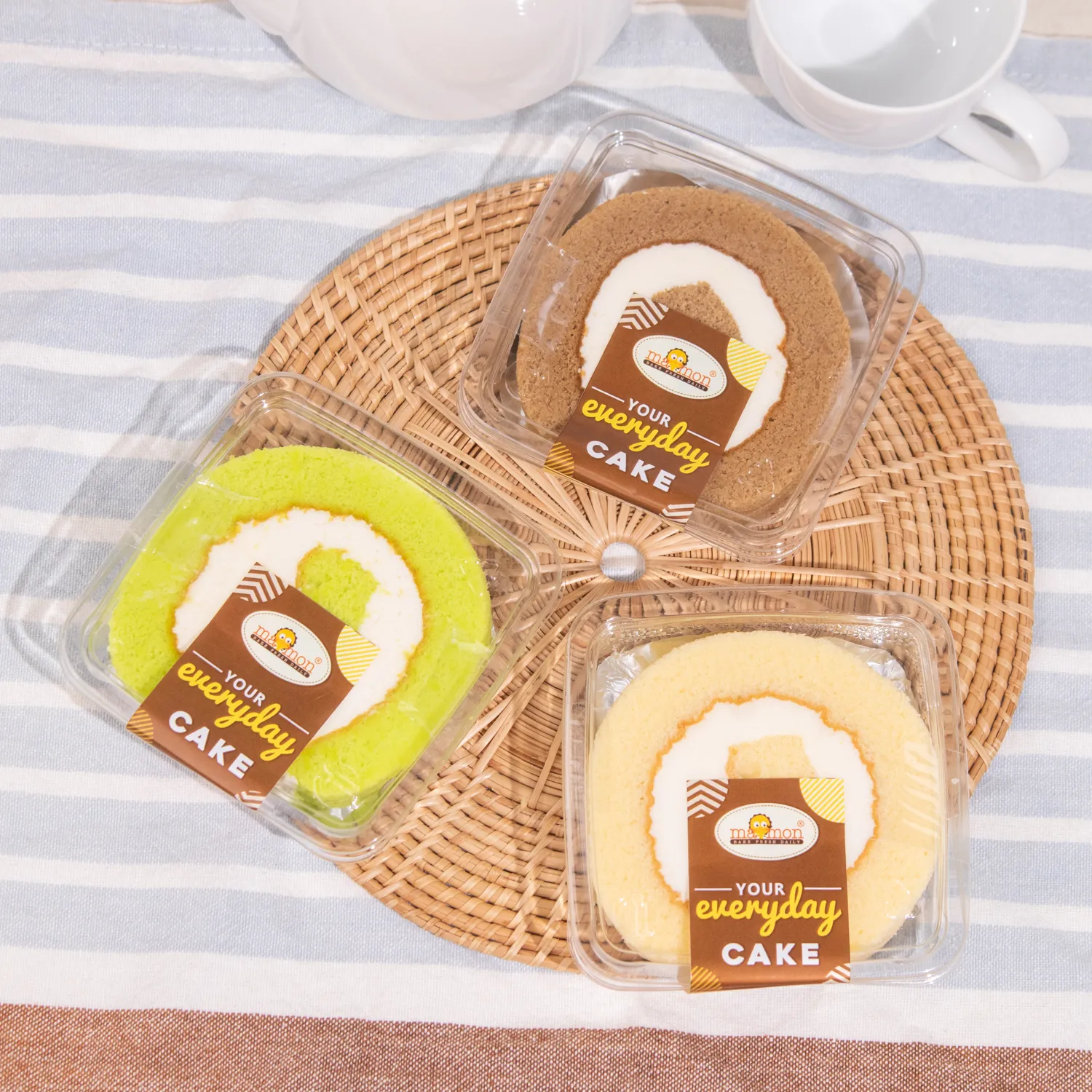 เค้กโรล เนื้อเค้กนุ่มแทรกด้วยครีมรสหวานละมุน มีให้เลือกหลายรสชาติทั้งวานิลลา ใบเตย และกาแฟ