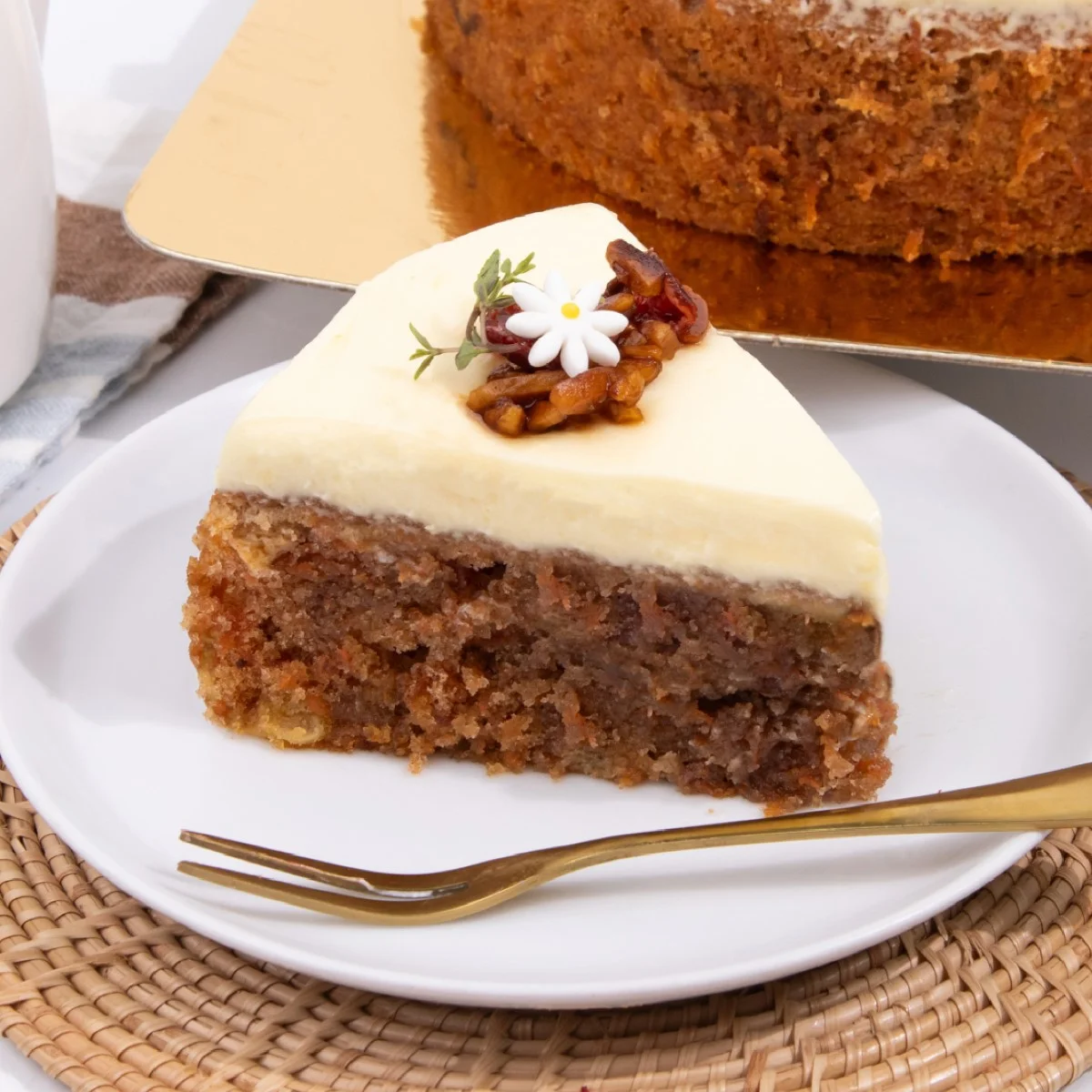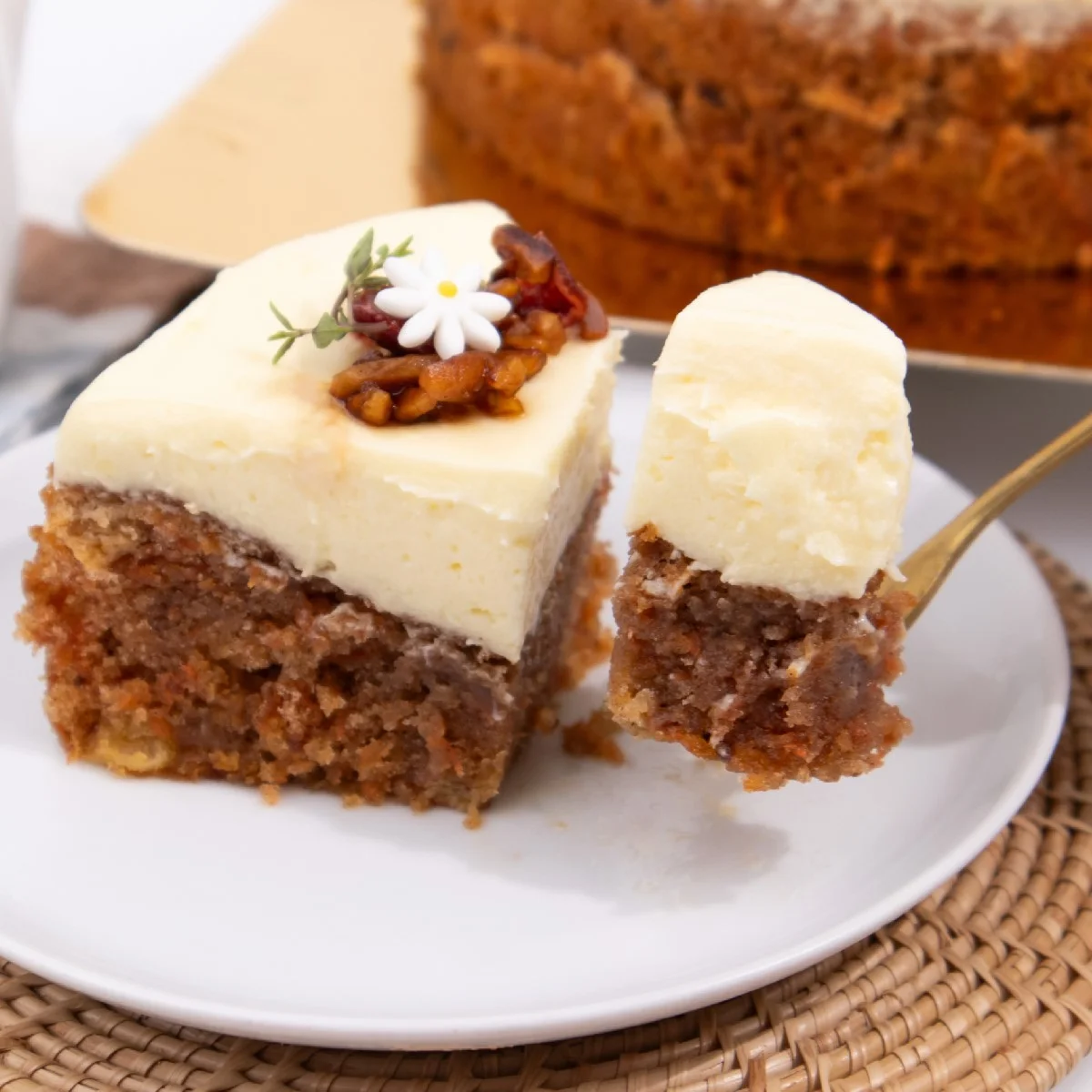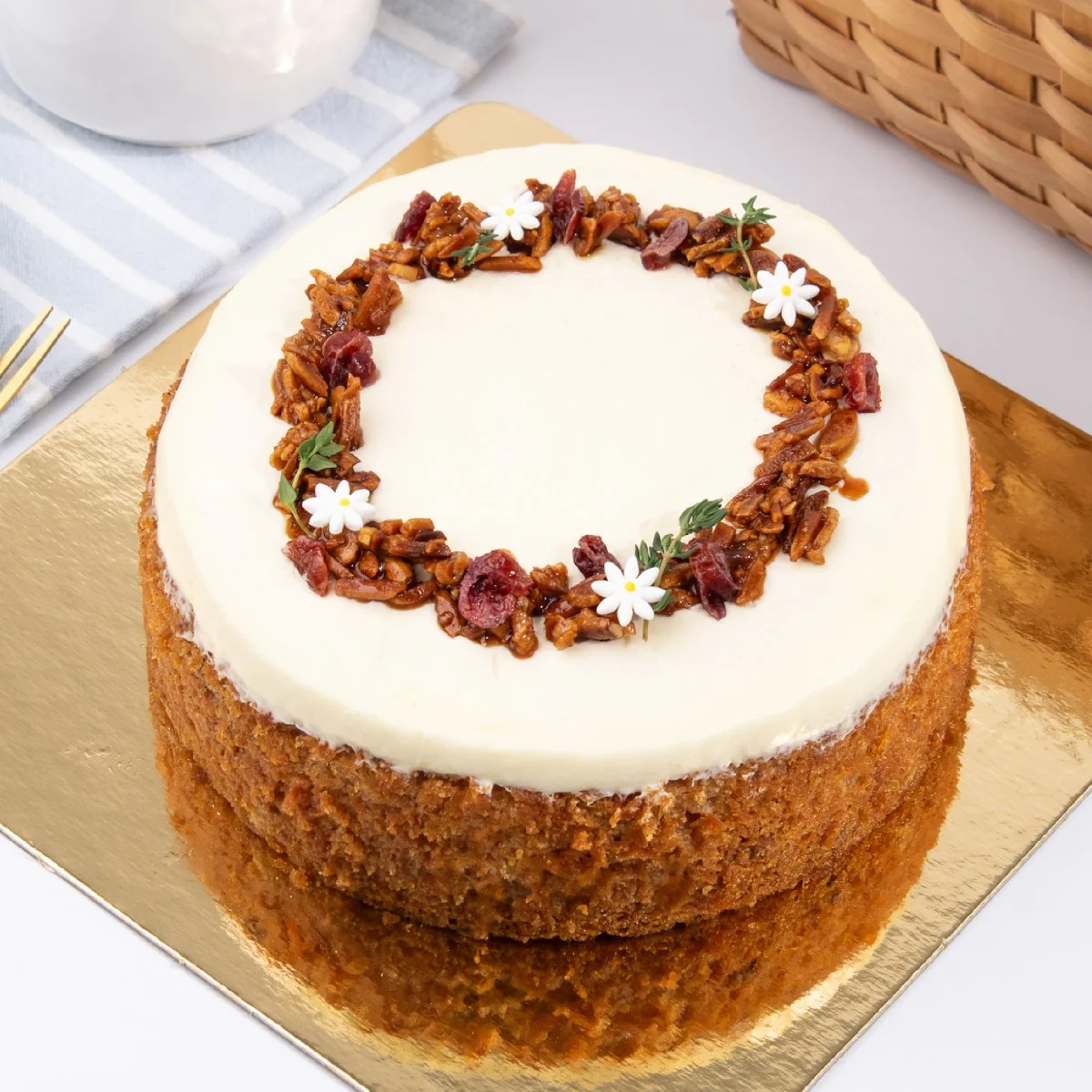 เค้กบันนี่แครอท เนื้อเค้กแครอท ท็อปด้วยครีมชีส และแต่งหน้าด้วย อัลมอนด์เคลือบคาราเมล และแครนเบอร์รี่