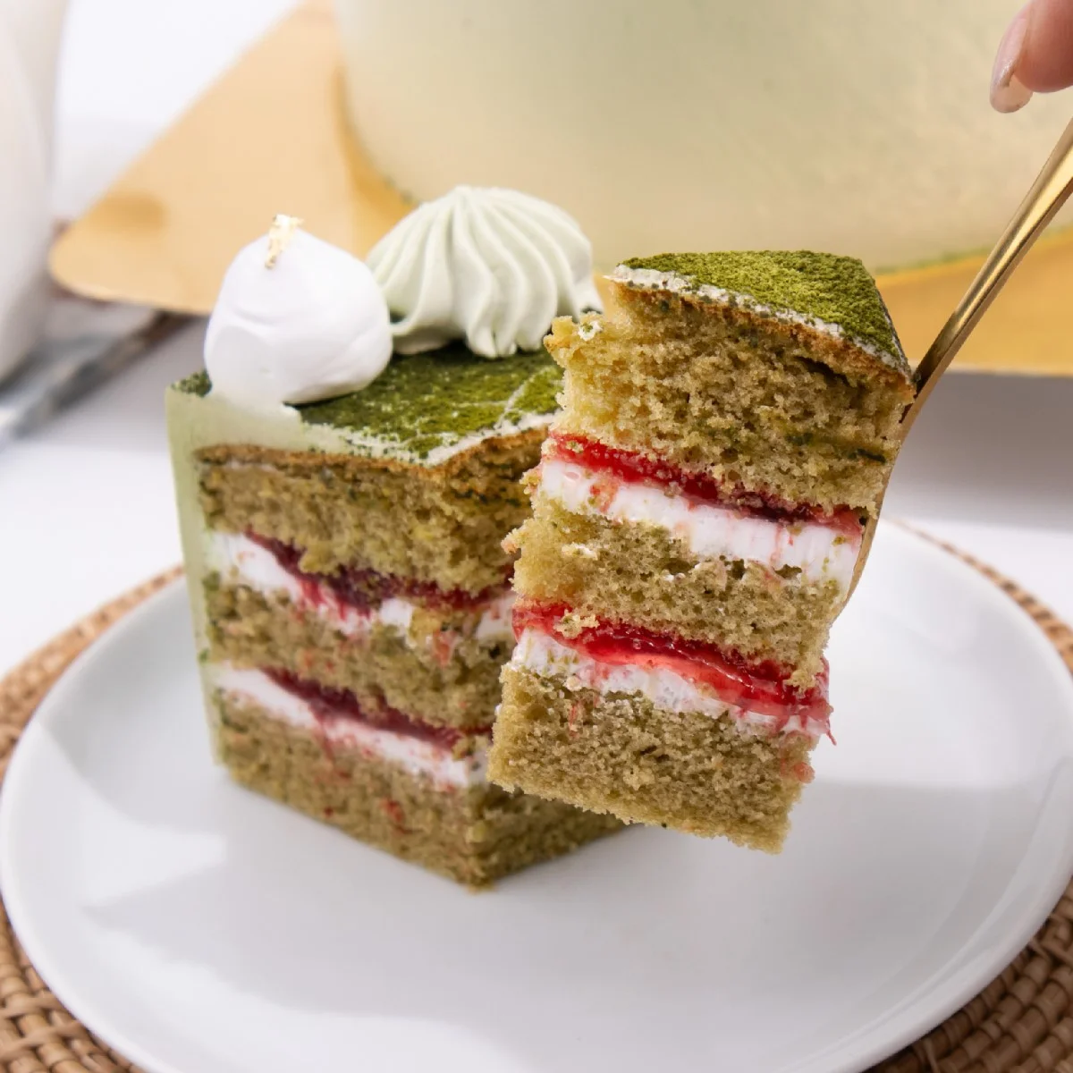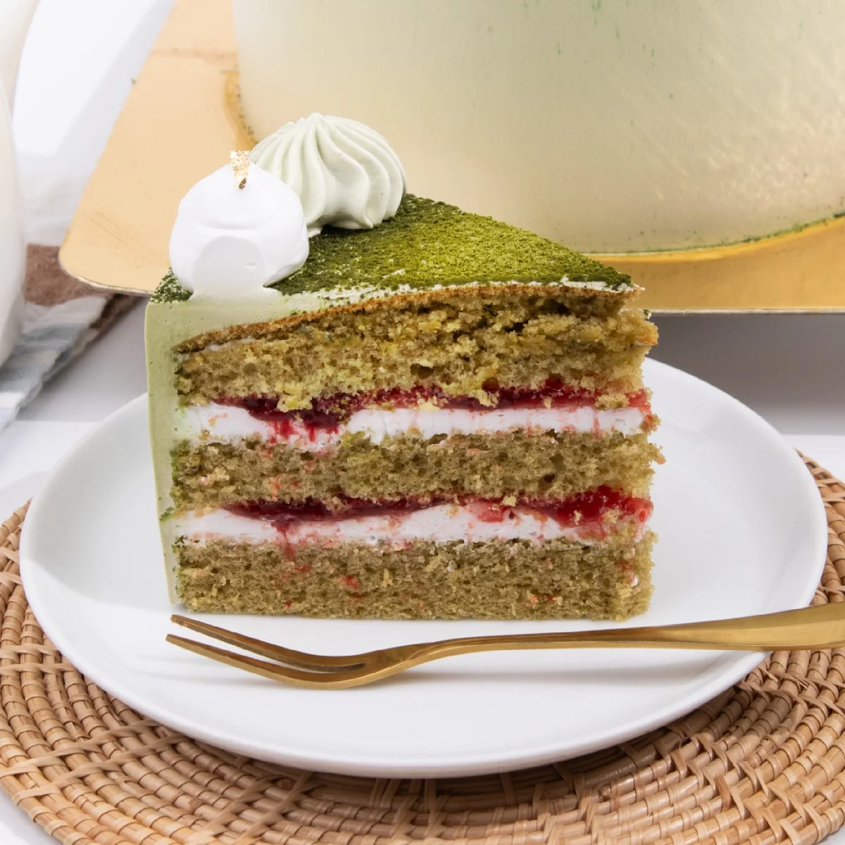 เค้กมัทฉะสตรอเบอร์รี่ เนื้อเค้กมัทฉะสอดไส้ซอสสตรอเบอร์รี่ ท็อปด้วย ผงอูจิมัทฉะนำเข้าจากญี่ปุ่น อร่อยละมุนในทุกคำ